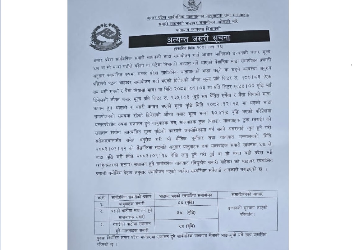 अन्तरप्रदेश यात्रुबहाक सवारी, पहाडी बाटोमा सञ्चालन हुने मालबहाक र तराईको बाटोमा सञ्चालन हुने मालबाहक सवारी साधनमा समान ५–५ प्रतिशतका दरले भाडा बढाइएको छ ।
